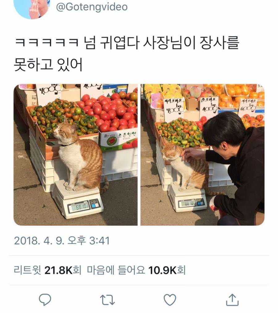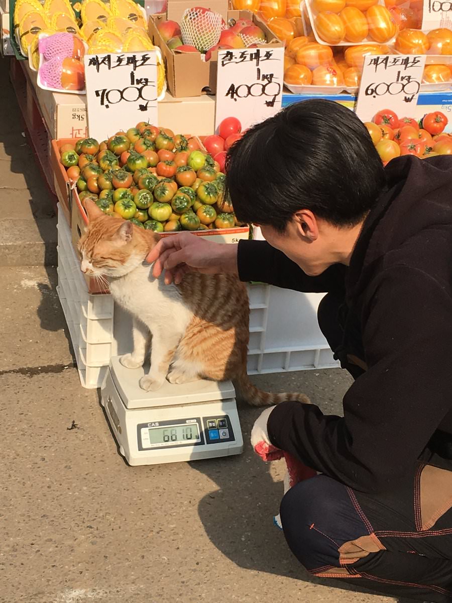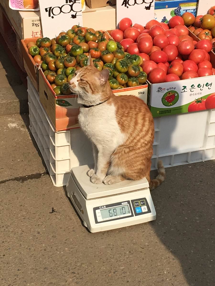 시장 한복판에서 몸무게 자랑하는 냥이 ㅋㅋ