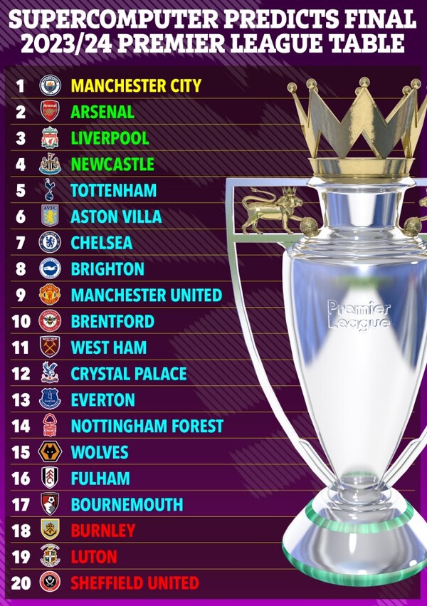 슈퍼컴퓨터는 첼시전 이후 토트넘 훗스퍼가 올 시즌 유럽축구연맹(UEFA) 챔피언스리그(UCL) 진출 순위에 들지 못한다고 예측했다.