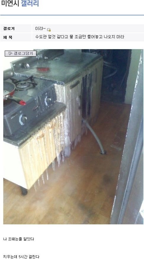 얼마나 추웠으면 흐르던 물이 얼었을까 .