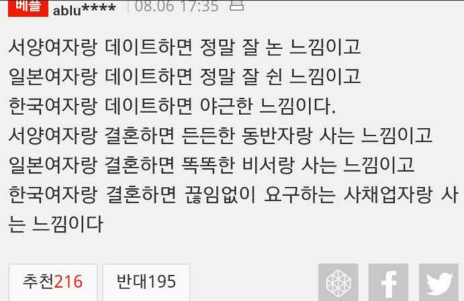 ¿¹¸¦µé¾î ÇѸ»ÀÌÀݾƿä...¼­¾ç¿©ÀÜ È­²öÇÏ°Ô Àß³î°í ÀϺ»¿©ÀÜ ³²ÀÚ¸¦À§ÇØ ÆíÇÏ°Ô ÇØÁÖ´Â°Ô ÀÖ°í ¿ì¸®³ª¶ó¿©ÀÜ ¸ðµç°É ÀÚ±âÀ§ÁÖ·Î ÇØ¾ßÇÏ°í ¸»ÇѸ¶µð À߸øÇϸé Á¤¸» ŻŻ Åи®°í ³²ÀÚ°¡ µ¥ÀÌÆ®ºñ¿ë ´Ù³»¾ßÇϰí...